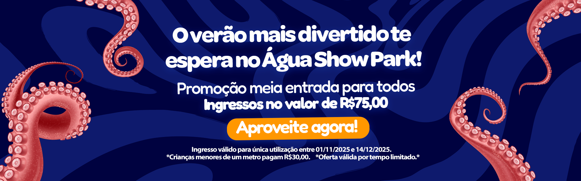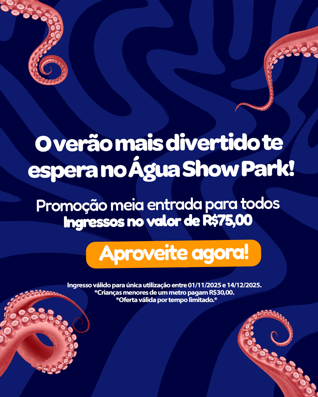 Seja qual for a sua idade, a alegria é garantida aqui no Água Show Park. Aqui você encontra piscinas para relaxar, toboáguas com muita adrenalina, áreas temáticas e atrações incríveis. Venha viver momentos especiais, dar muita risada e sentir a energia do verão de um jeito único! ✅Ingressos de R$150,00 por apenas R$75,00 (utilize em qualquer dia até 14/12/2025, conforme nosso calendário.) ✅Passaporte Família: Pague 2 e leve 3 ingressos por R$150,00! A compra deve ser realizada em nosso site com 1 dia de antecedência da sua visita. (Os 3 ingressos devem ser utilizados no mesmo dia, em qualquer data até 14/12/2025, conforme o nosso calendário.) 💻 Acesse nosso site http://aguashowpark.com.br - Link na bio 📱 WhatsApp: (48) 3369-2354 📍 Rodovia Armando Calil Bullos(SC 403), 3868 - Ingleses,Florianópolis - SC #ÁguaShowPark #Parqueaquatico #SantaCatarina #Temporadadeverão #Florianopolis #DiversãoemFlorianópolis #Adrenalina #Verão #Novembro #Diasdefuncionamento #IlhadamagiaButton